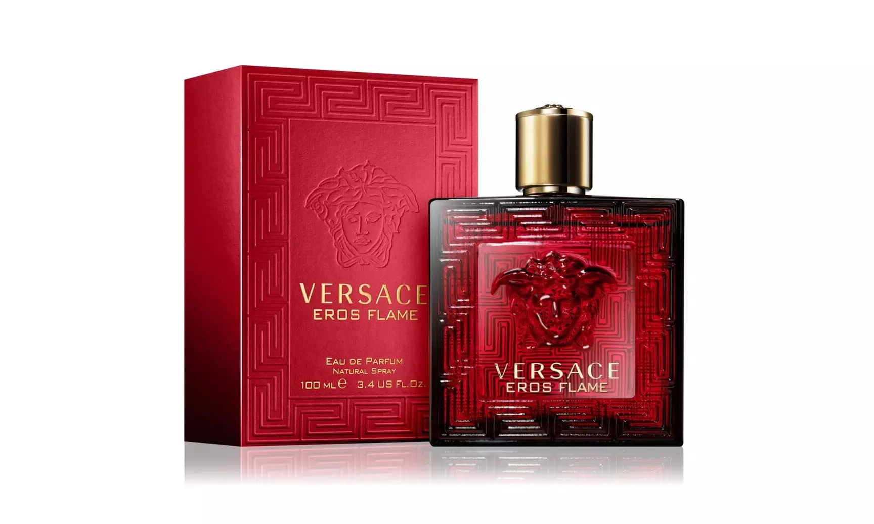 Versace Eros Flame (3.4 oz) is a spicy-amber-woody Eau de Parfum for men, known for its vibrant, contrasting scent profile featuring bright citrus (lemon, mandarin, chinotto) with fiery black pepper, aromatic rosemary, and a warm, sweet base of vanilla, tonka bean, sandalwood, and woods, creating a sensual, confident, and passionate fragrance ideal for dates or evenings, balancing freshness with deep warmth.